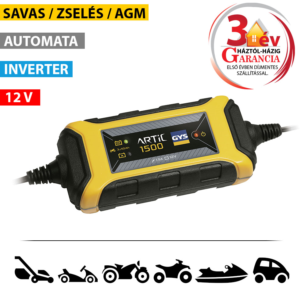 Kifejezetten motorok, jet-skik, kartingok, quadok vagy fűnyírók 12V-os akkumulátorának töltésére fejlesztették ki. Az ARTIC 1500 (1.5 A) mikroprocesszorral ellenőrzött, automata töltést biztosít. Hatékony, kompakt és könnyű, 2-szer olyan gyors felügyelet nélküli töltést garantál, mint egy hagyományos akkumulátortöltő.